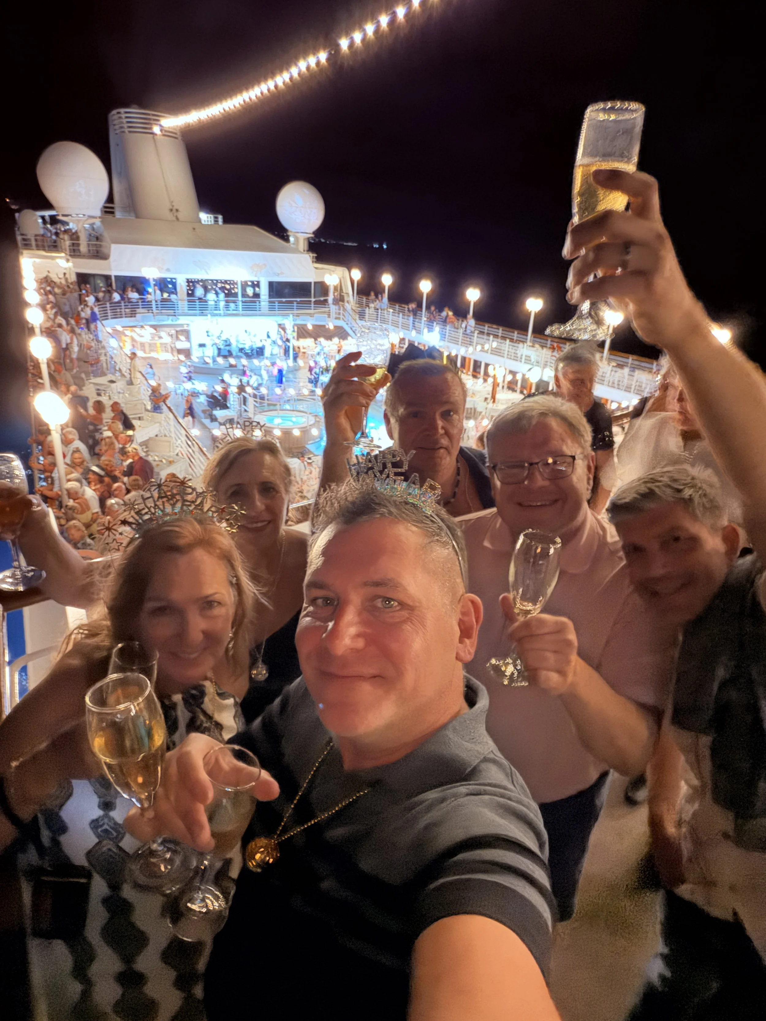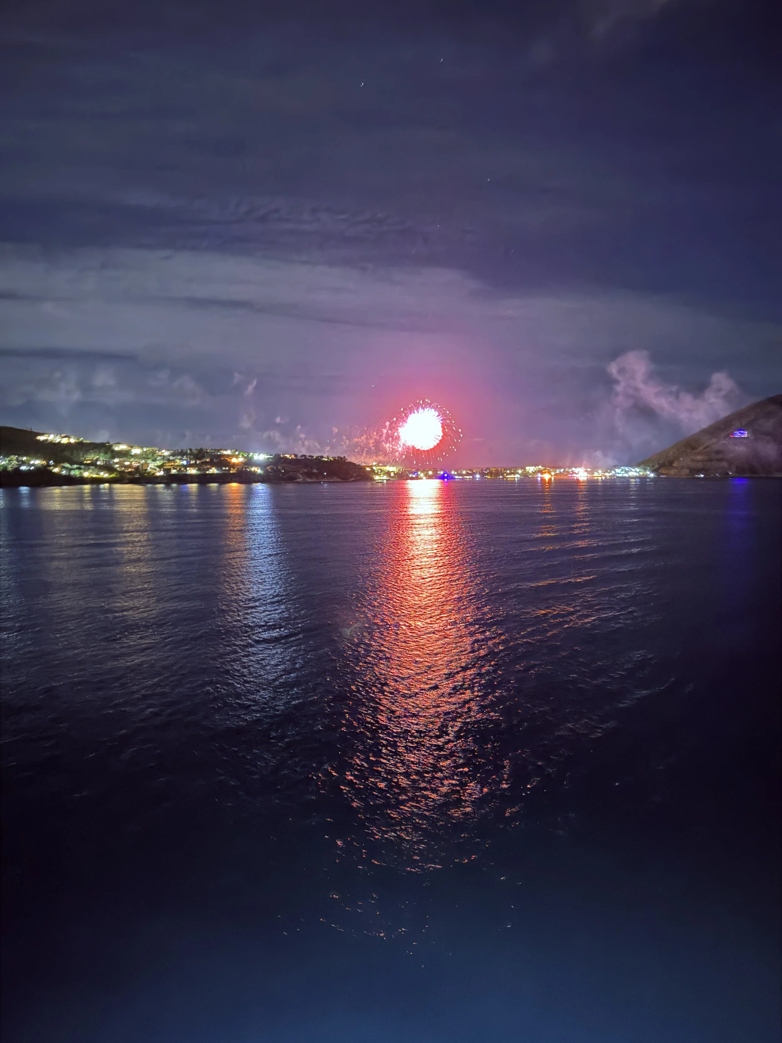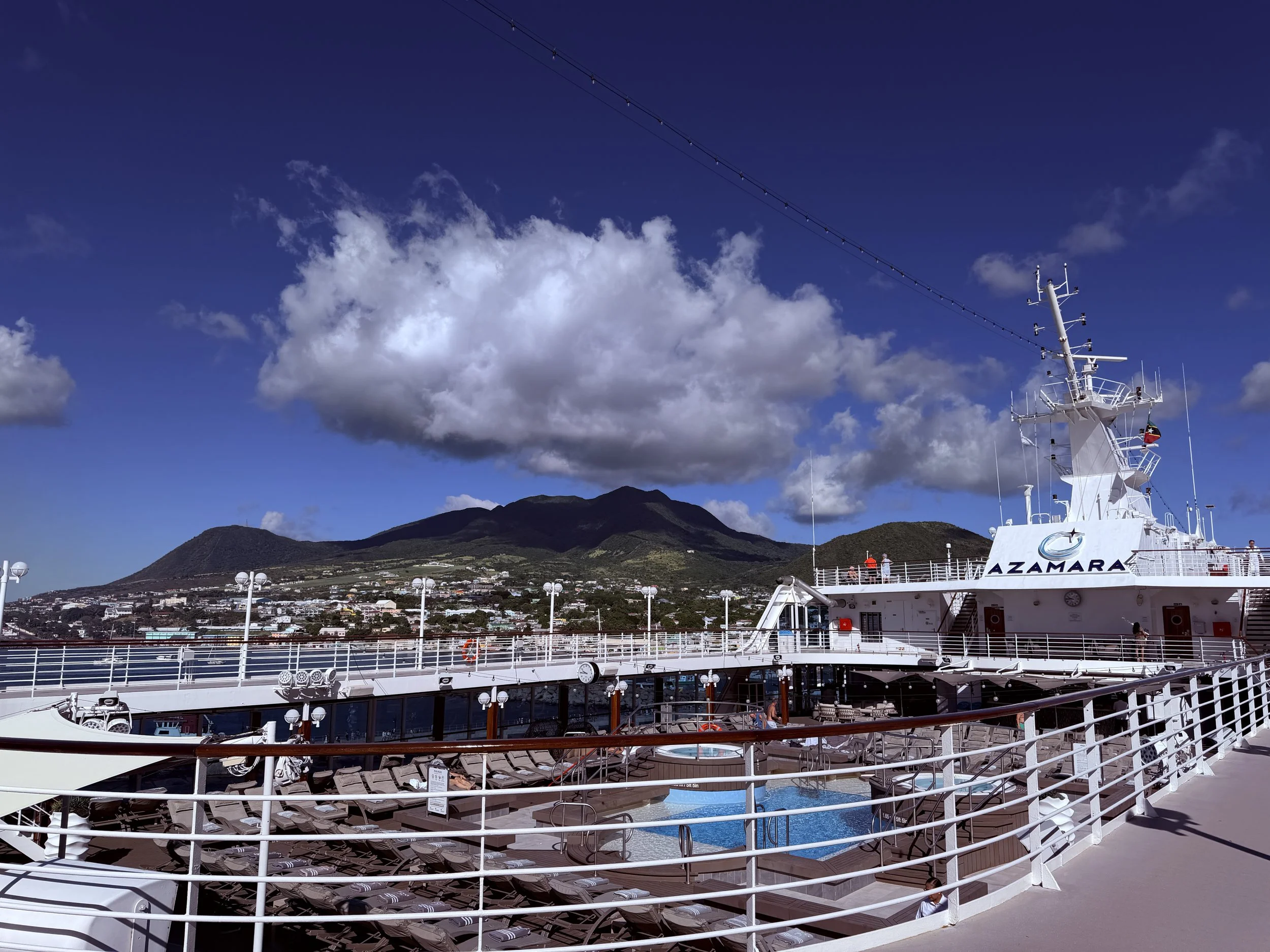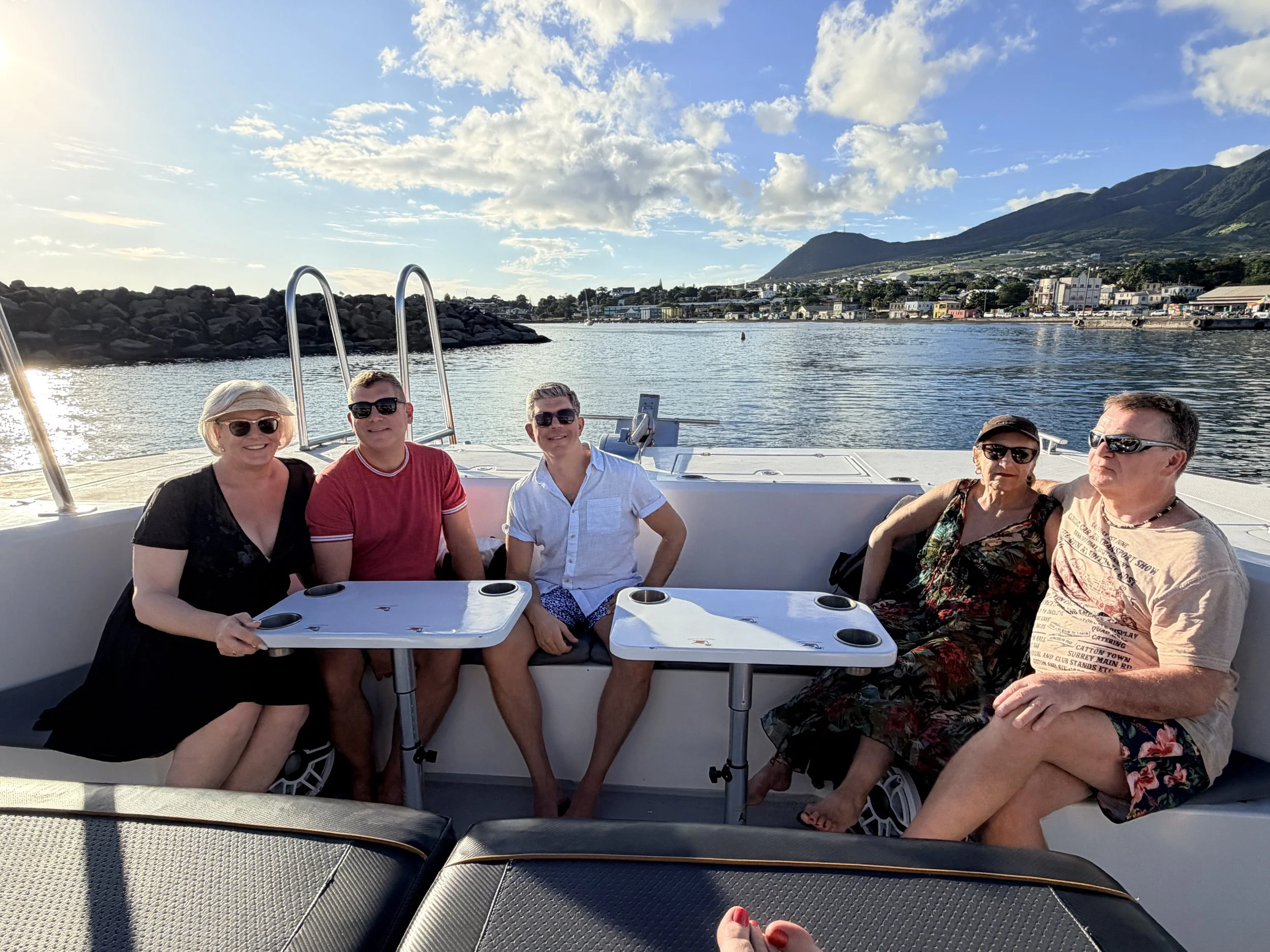 ST KITTS: The last day of 2025 found us in port at St Kitts. It was beautiful. Susan had previously chartered us a sunset catamaran cruise that afternoon. The Orange Cat was awesome. Just the group of 7 (no Sarah due to sickness) of us on a sail out to a protected harbor area for a quick swim. We were able to watch the sun set as we sailed back toward our ship for New Year’s Eve on the top deck of the Quest.