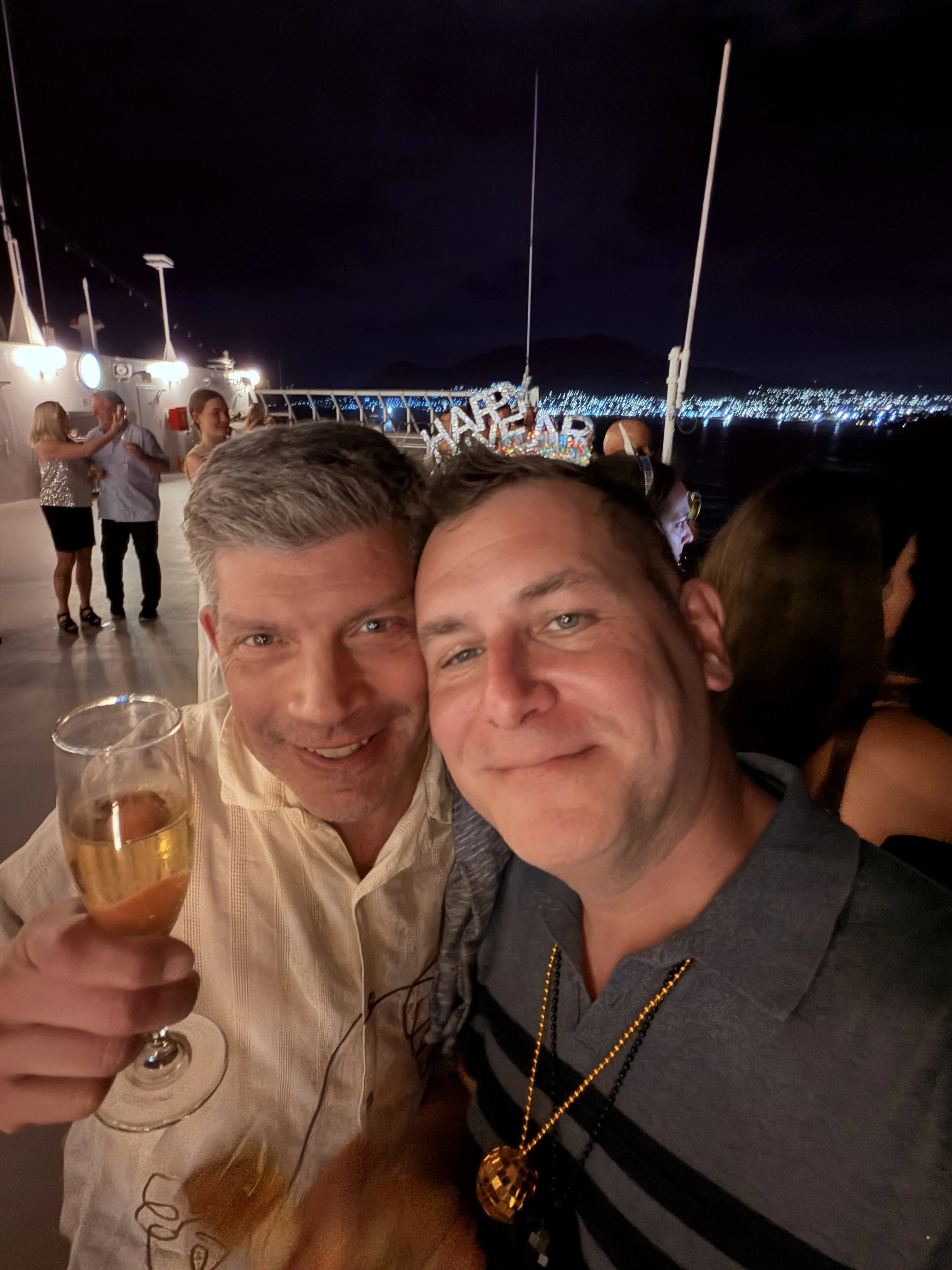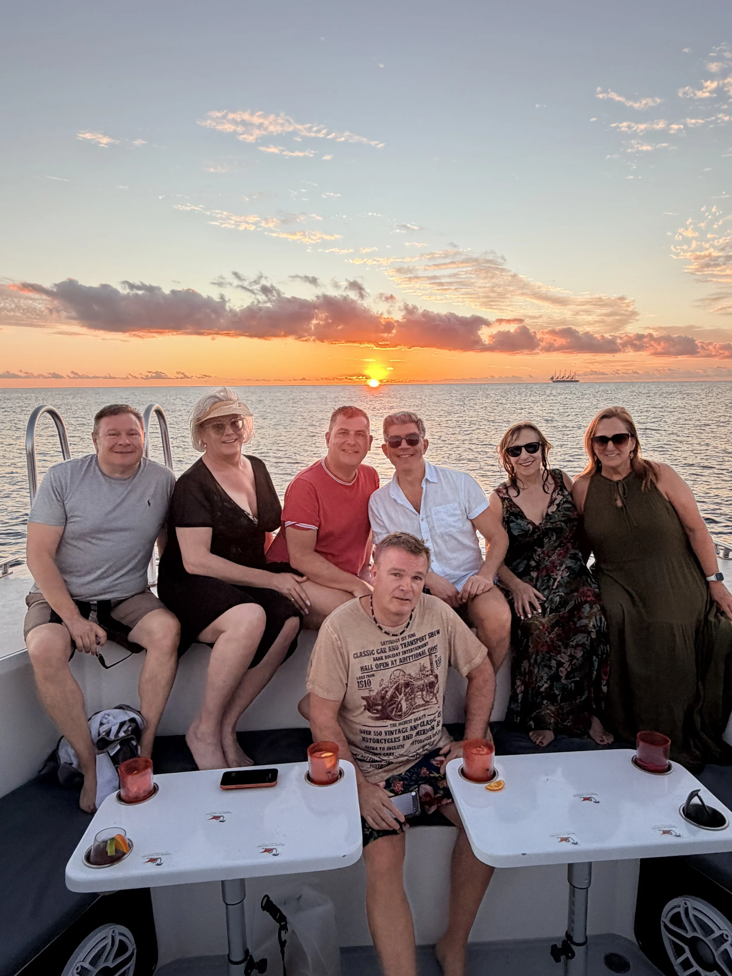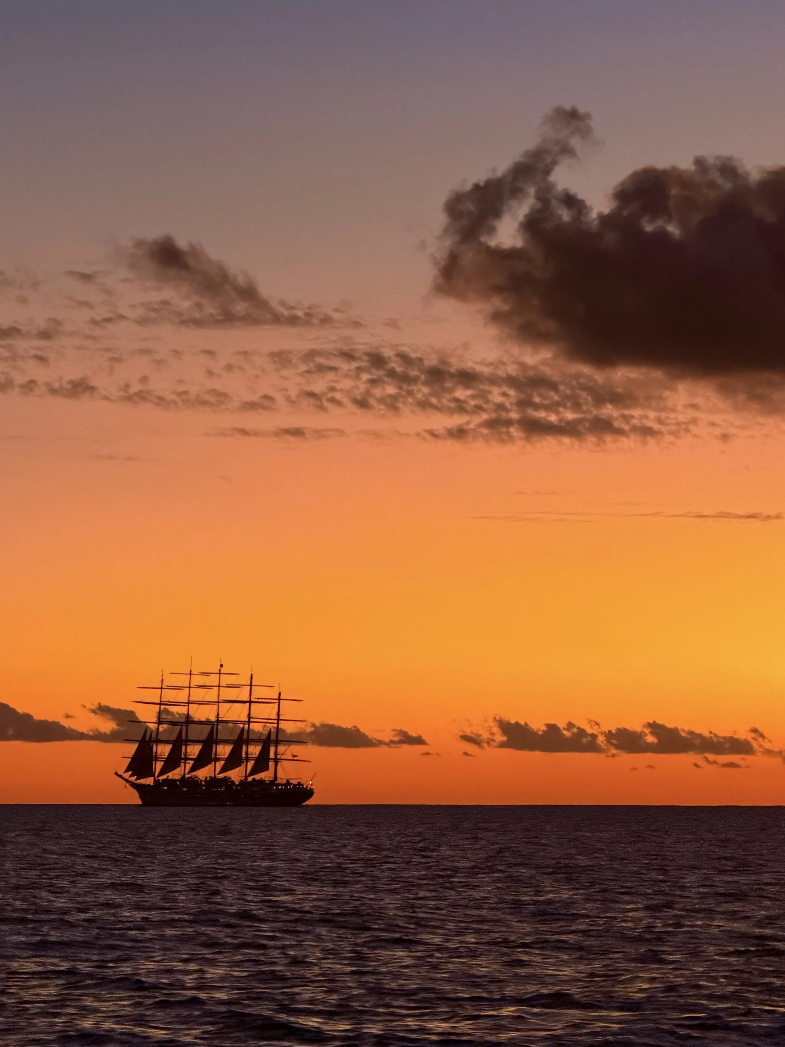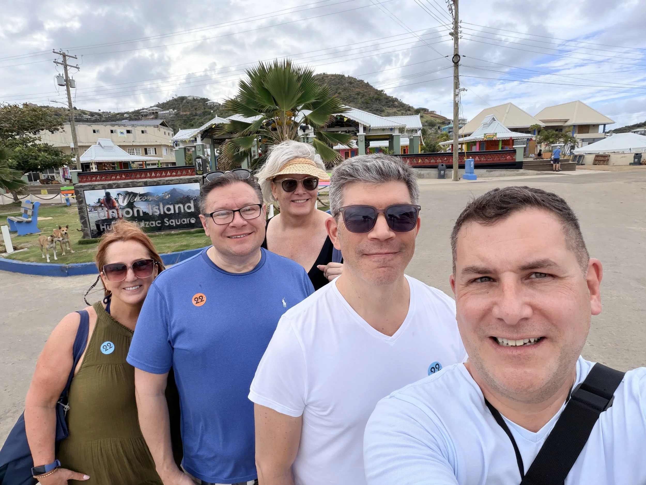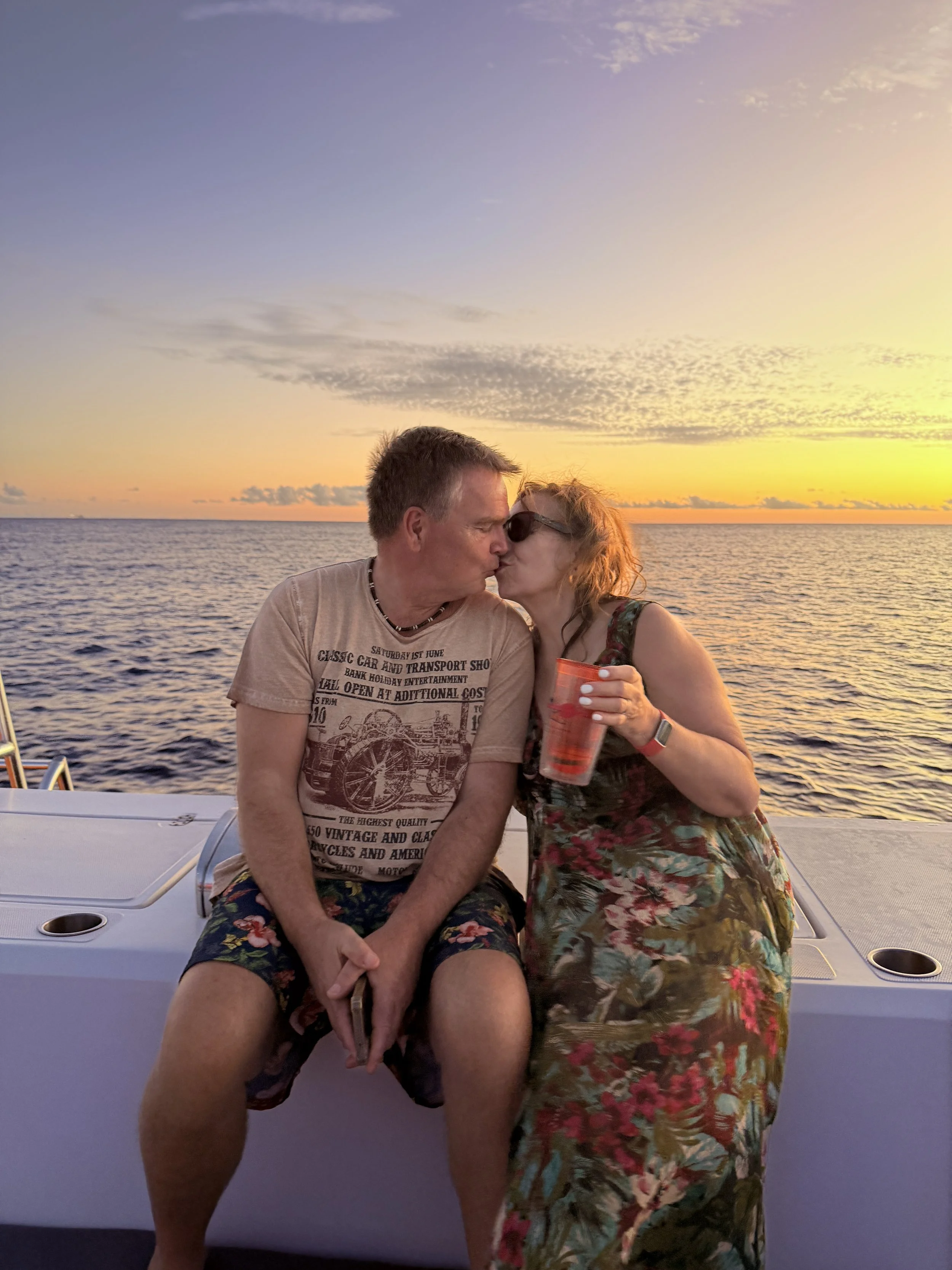 ST KITTS: The last day of 2025 found us in port at St Kitts. It was beautiful. Susan had previously chartered us a sunset catamaran cruise that afternoon. The Orange Cat was awesome. Just the group of 7 (no Sarah due to sickness) of us on a sail out to a protected harbor area for a quick swim. We were able to watch the sun set as we sailed back toward our ship for New Year’s Eve on the top deck of the Quest.