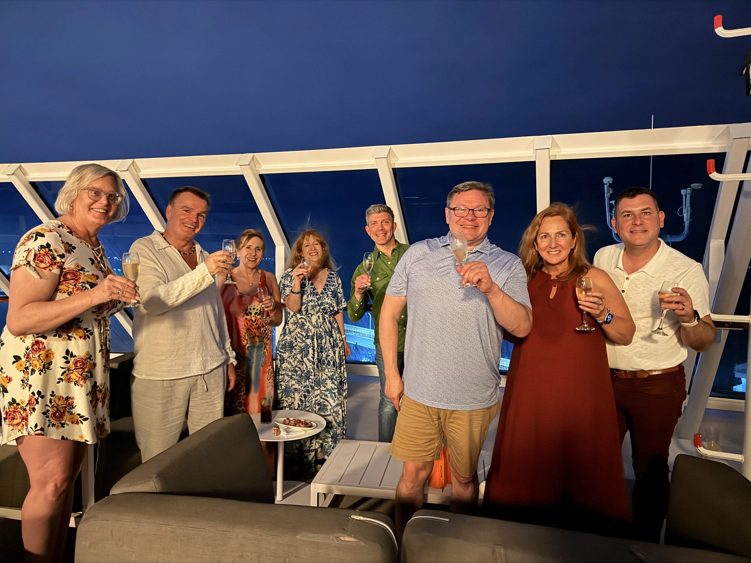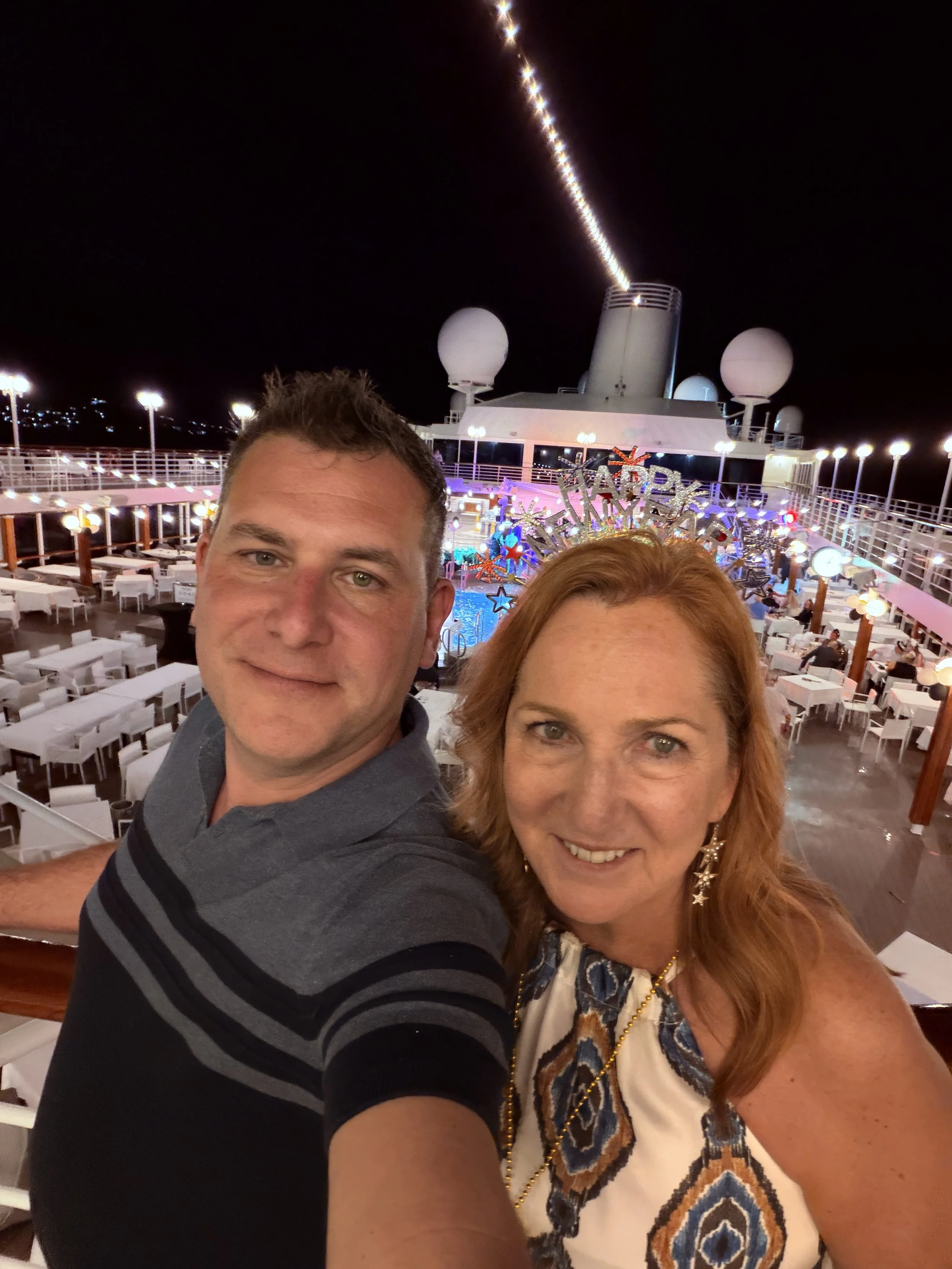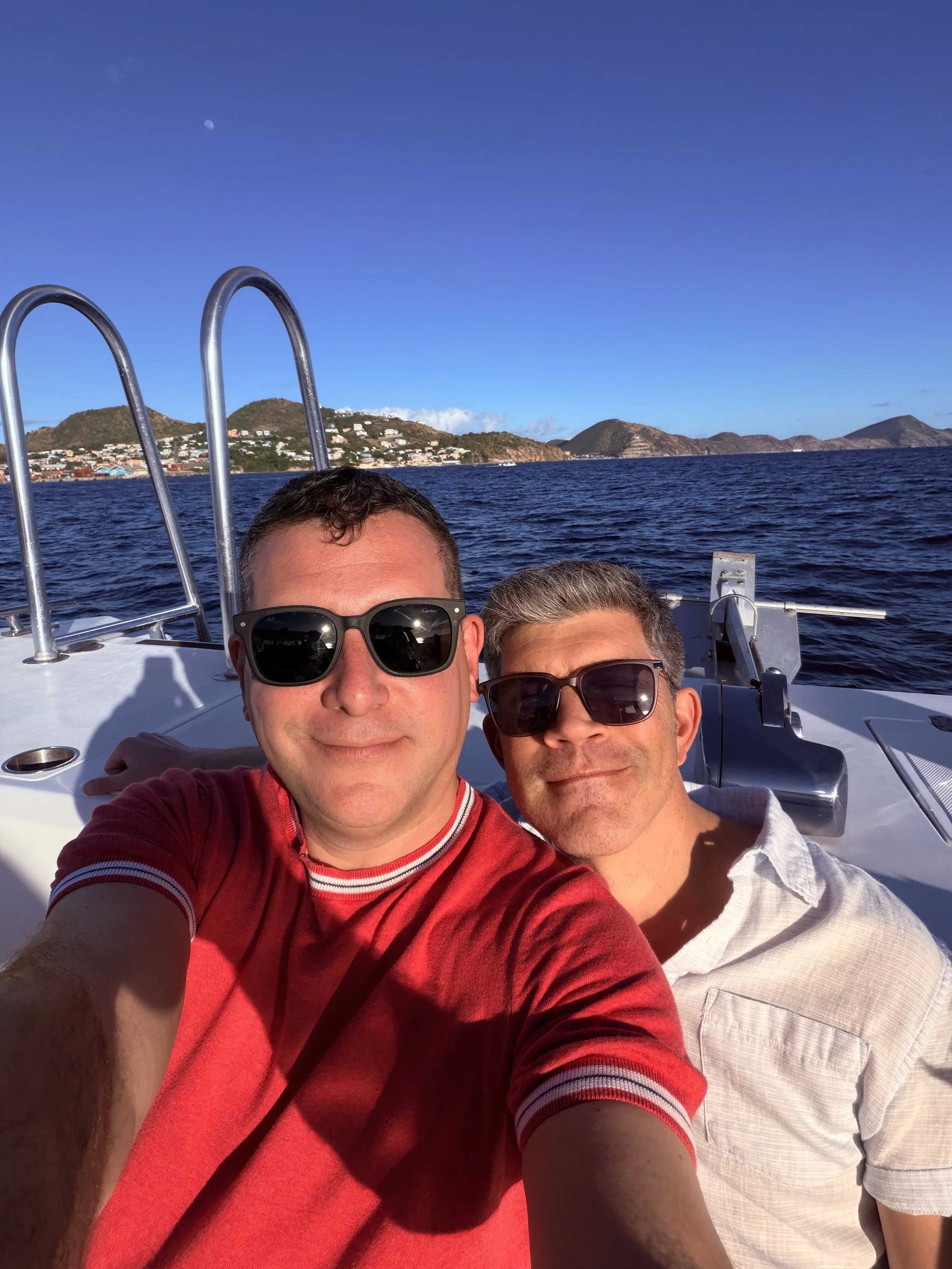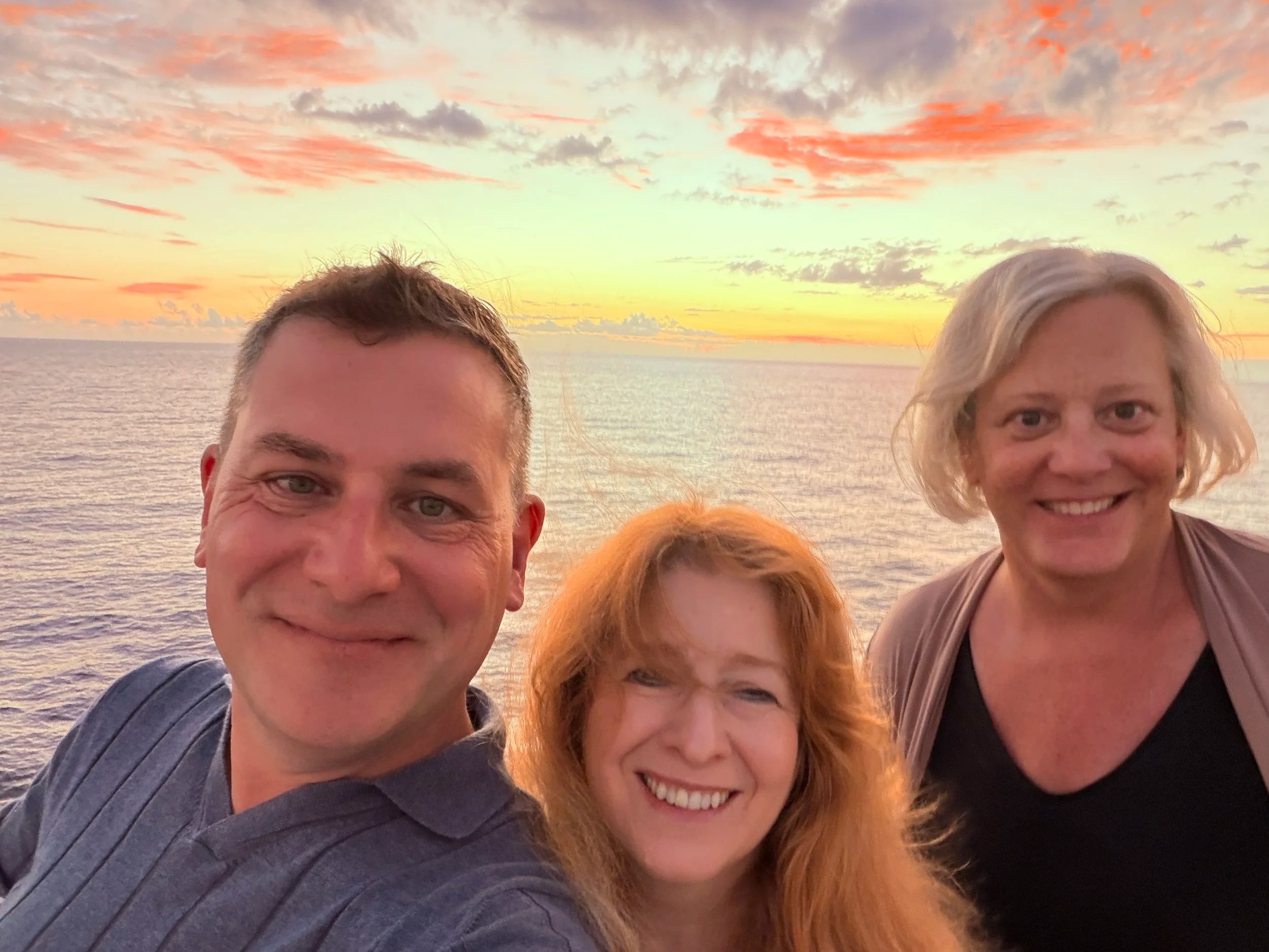 ST KITTS: The last day of 2025 found us in port at St Kitts. It was beautiful. Susan had previously chartered us a sunset catamaran cruise that afternoon. The Orange Cat was awesome. Just the group of 7 (no Sarah due to sickness) of us on a sail out to a protected harbor area for a quick swim. We were able to watch the sun set as we sailed back toward our ship for New Year’s Eve on the top deck of the Quest.