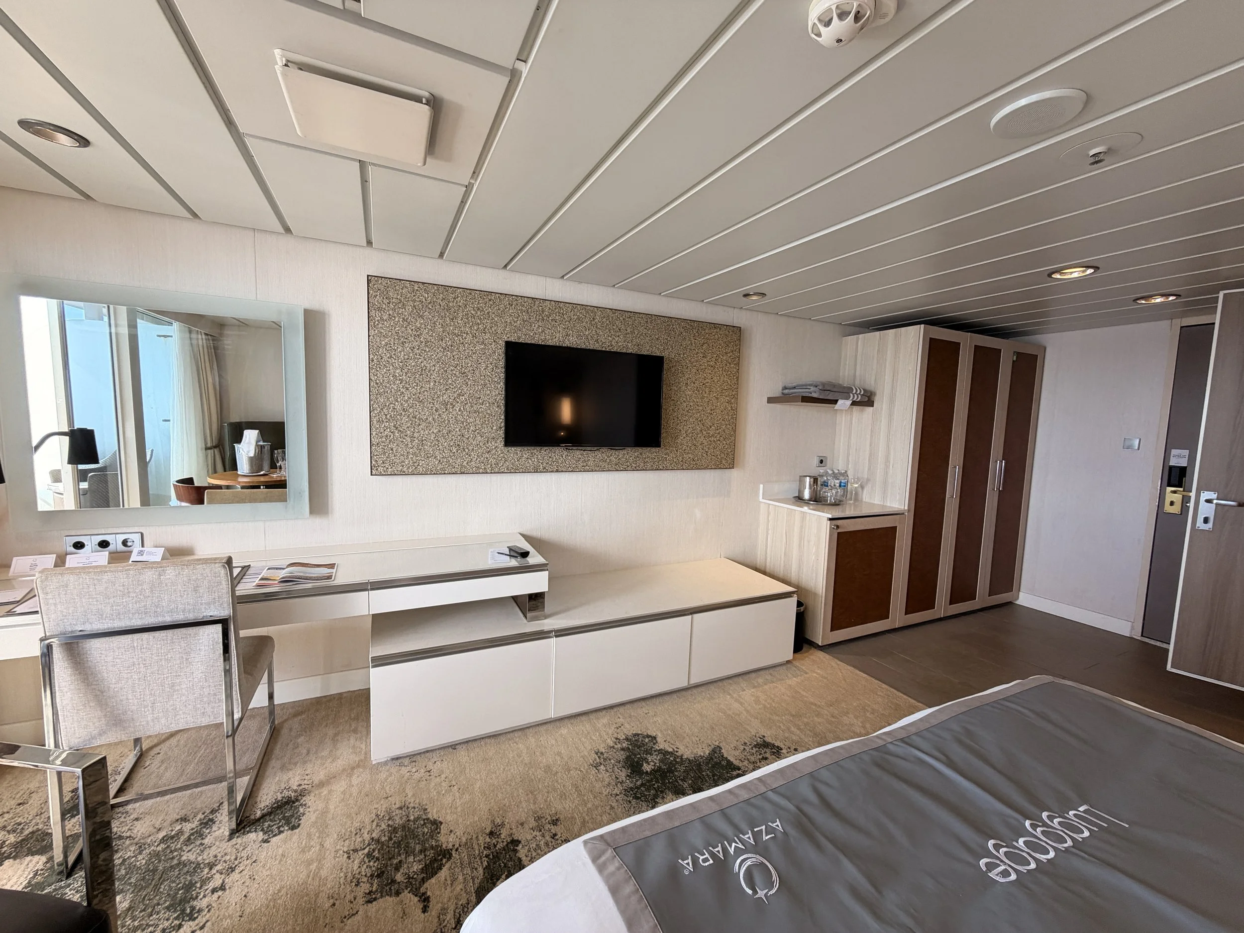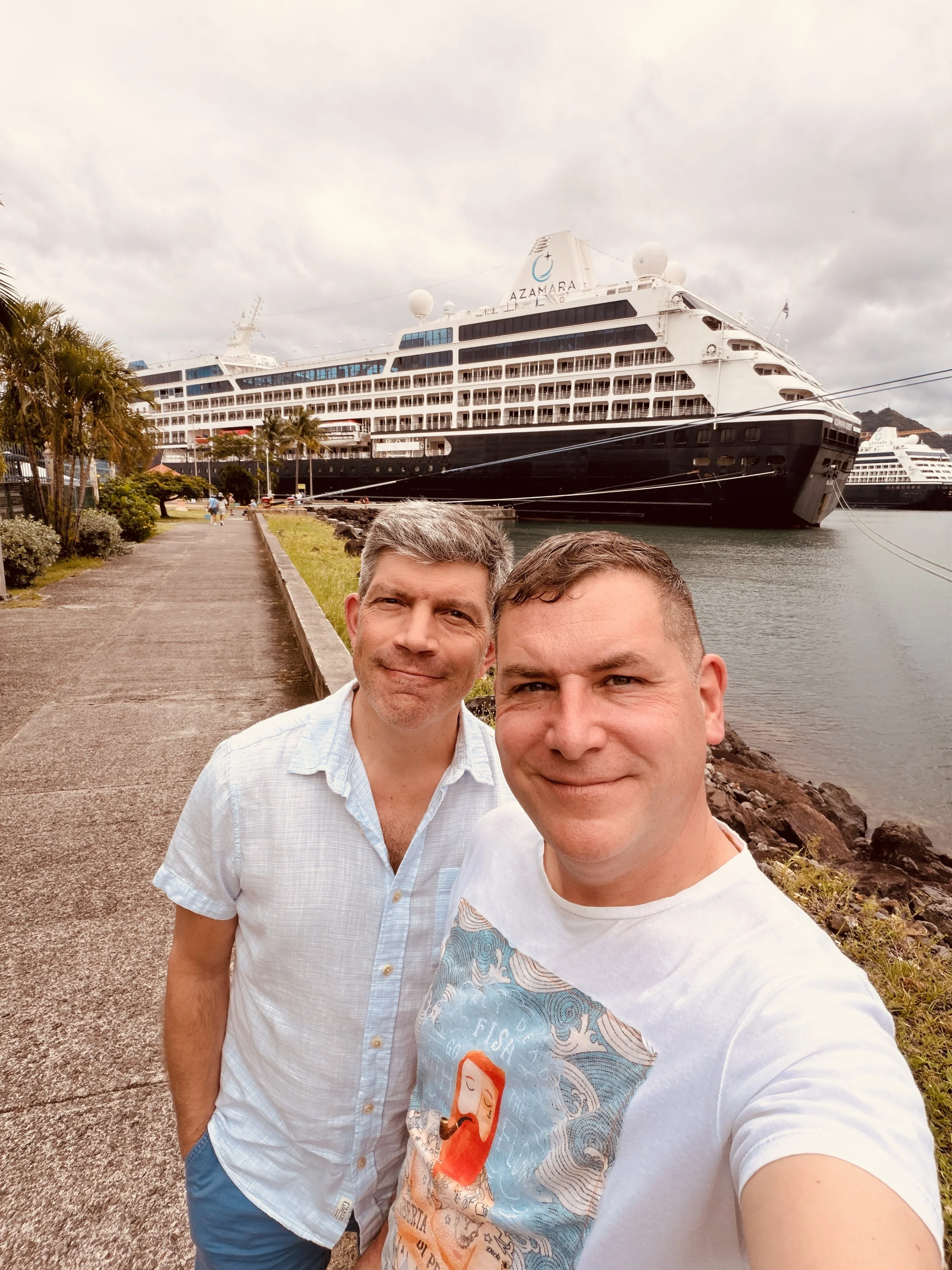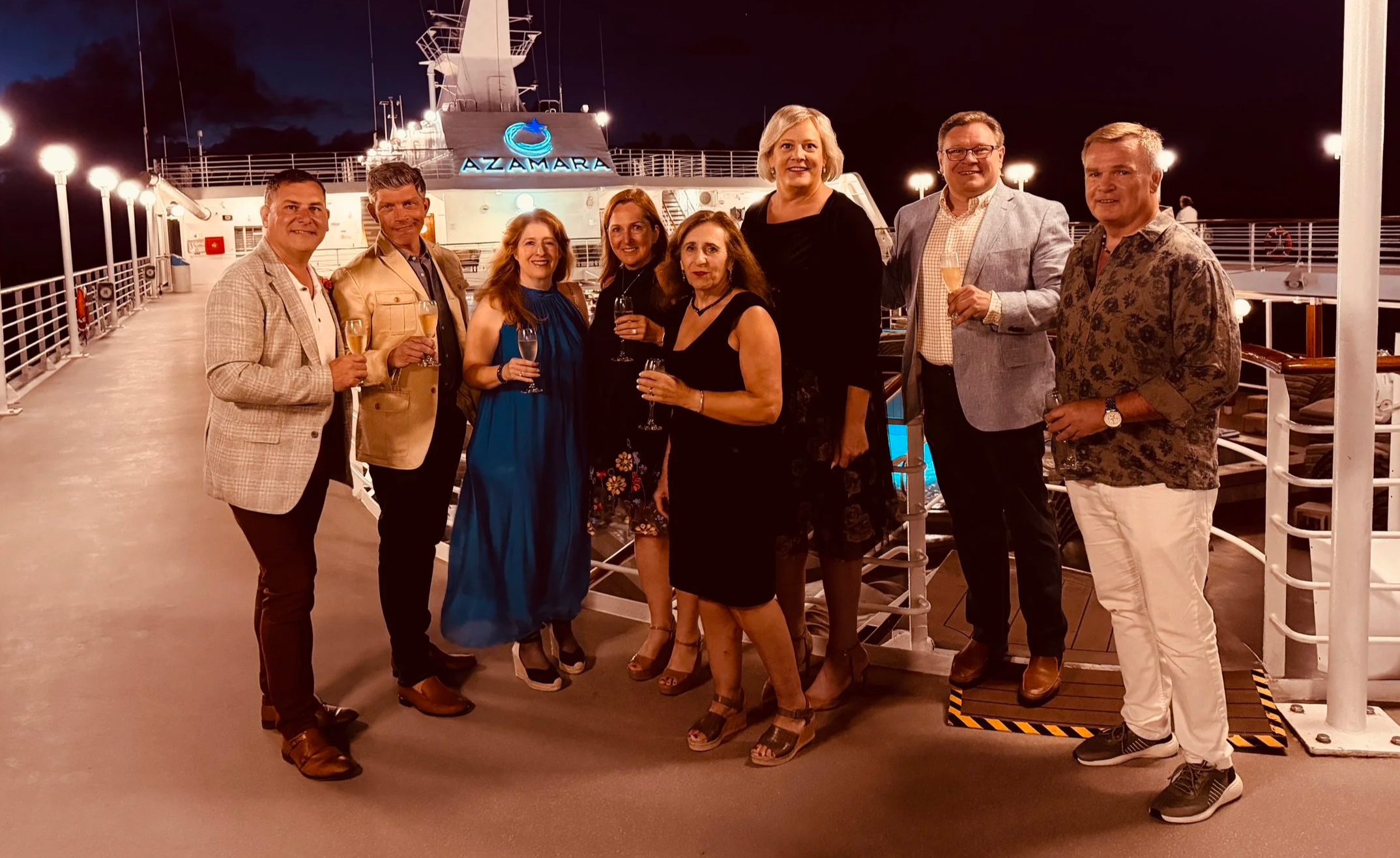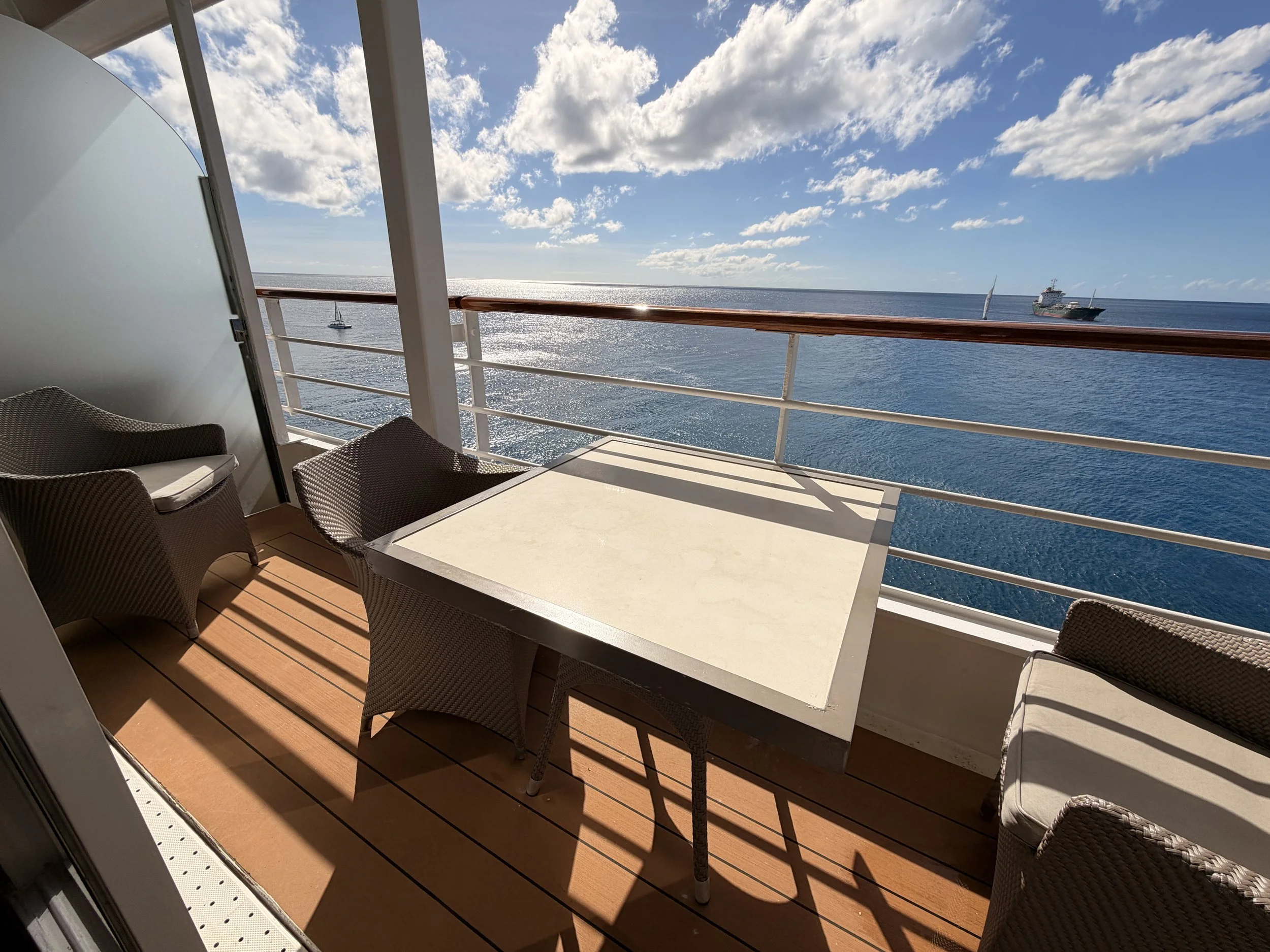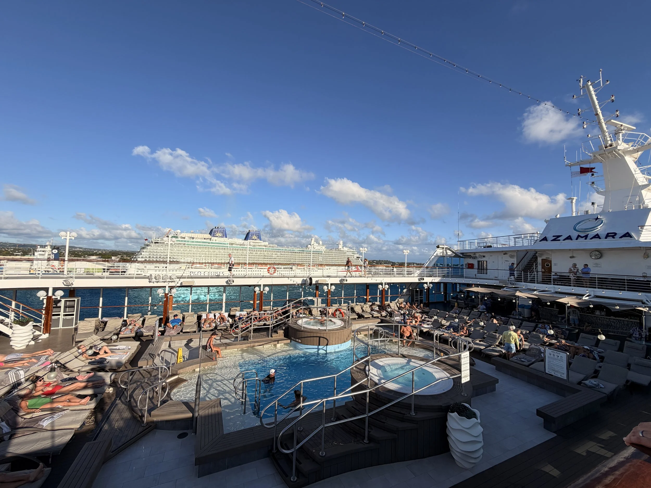 BARBADOS: The Azamara Quest is a smaller ship of about 700 passengers. By now, you know that John and I typically like small ship adventures, so this is a big ship for us. We loved it. We had bid on an upgraded suite right after we booked the cruise. Our bid was accepted in early December, so we were staying in a Continent Suite (which is over 1 1/2 times the size of a standard Veranda Room). Our spacious room had a very large balcony, large bathroom (very unusual on a ship), tons of storage, and also came with full butler service. We settled in quickly and toured the ship before our departure. We met up with everyone for a lovely sunset toast before dinner.